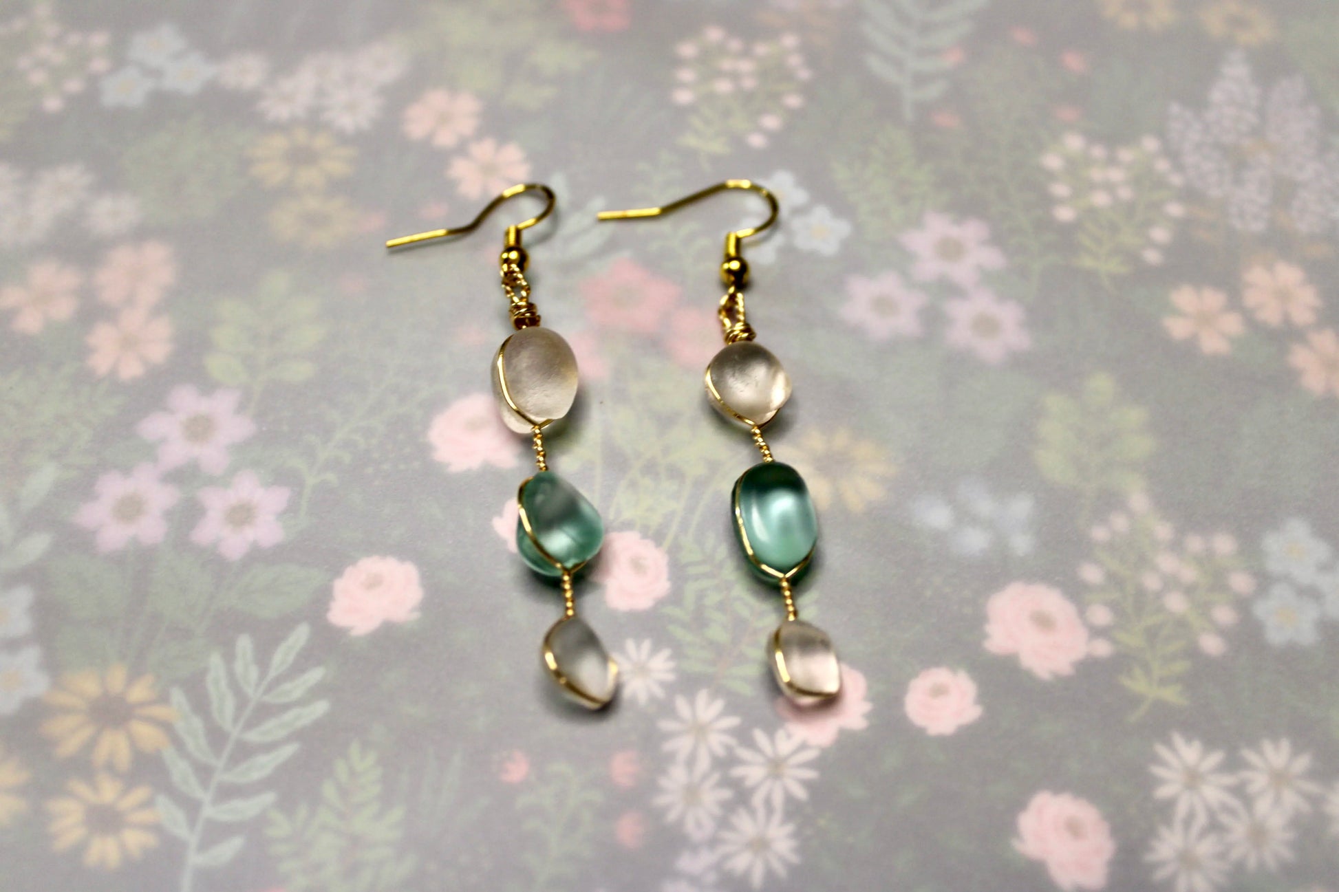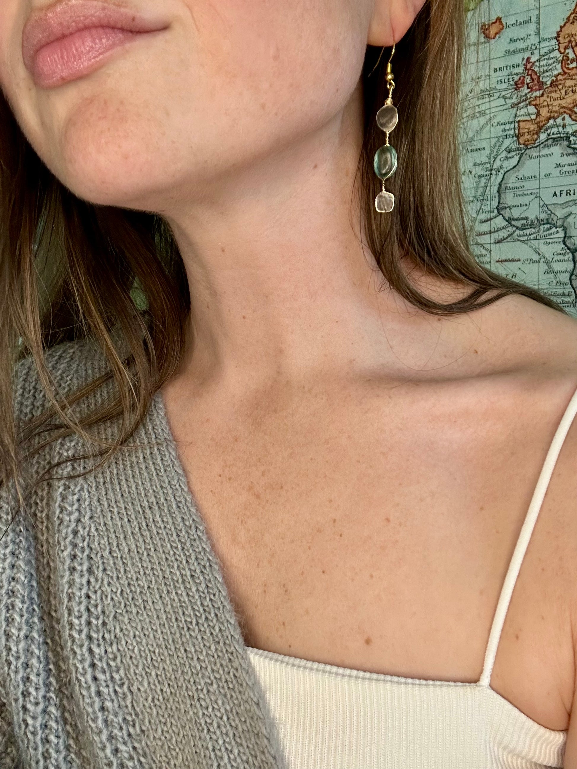 Handpicked sea glass in shades of blue and clear dangles gracefully from gold wire, secured so they stay put through your day. These one-of-a-kind earrings strike the perfect balance between sophisticated and playful—ideal for anyone who loves a little whimsy with their elegance. A sweet statement piece that feels authentically you.